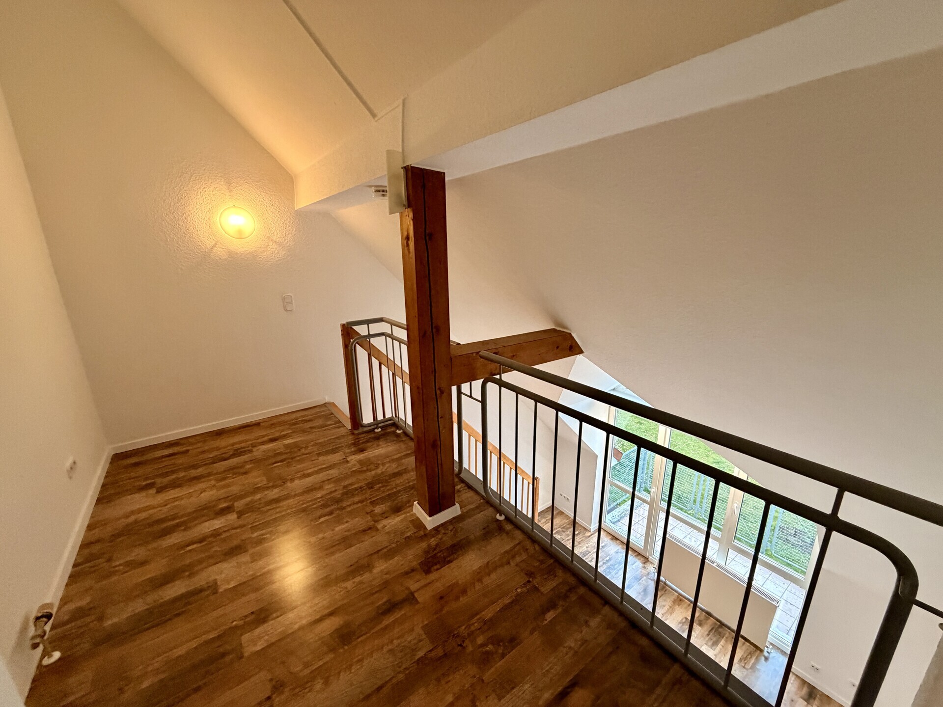 Über eine Holztreppe erreichen Sie die obere Etage mit Empore und dem geräumige Badezimmer.